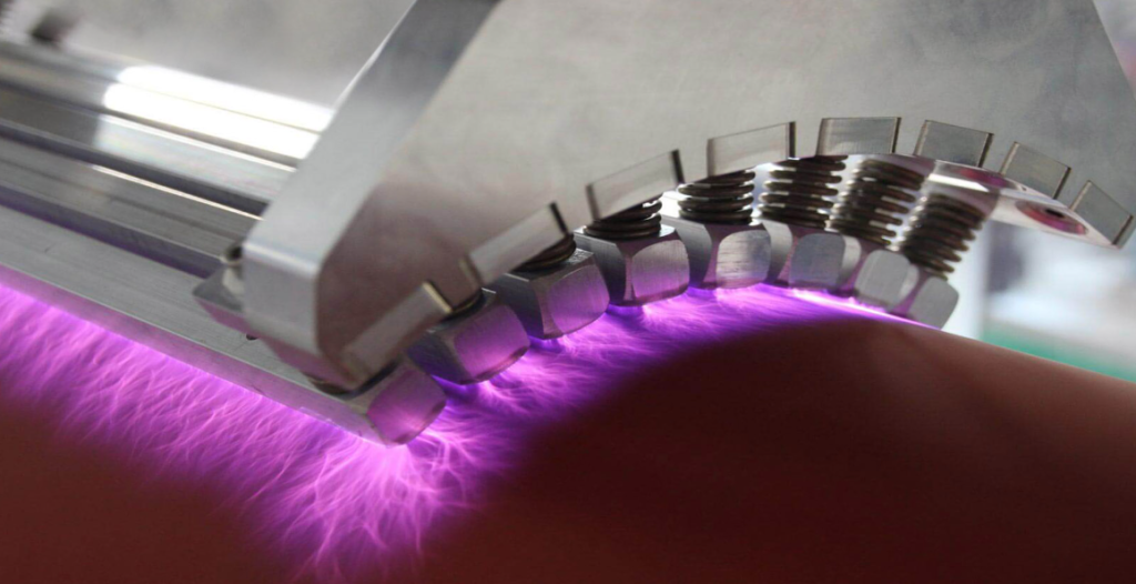 Типичная установка состоит из генератора, электрода, заземленного вала и системы охлаждения. Процесс непрерывный: лист ABS, HIPS-пластик или полиолефиновый рулонный материал пропускается через зону разряда. Эффективность обработки зависит от мощности, скорости движения материала и зазора.